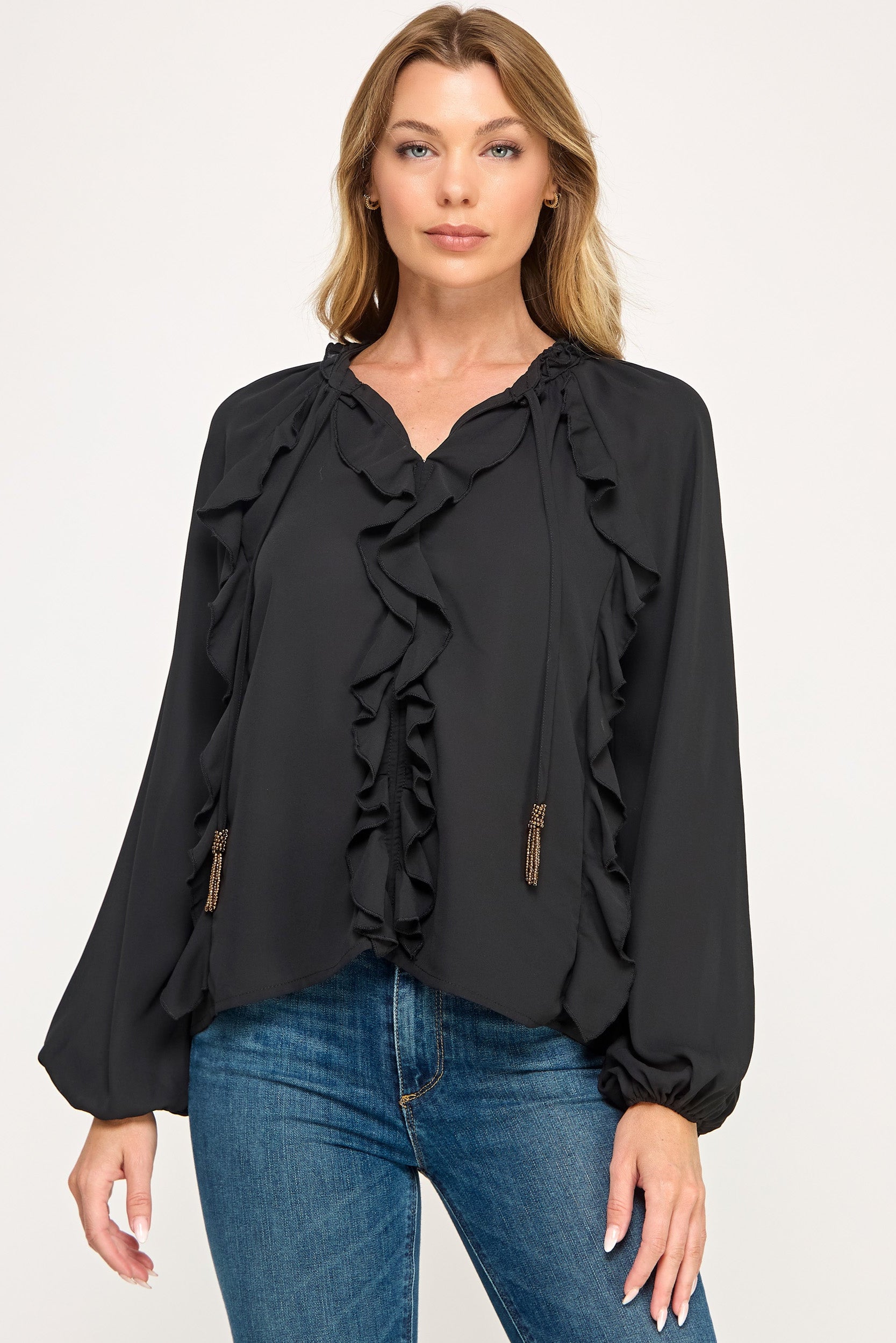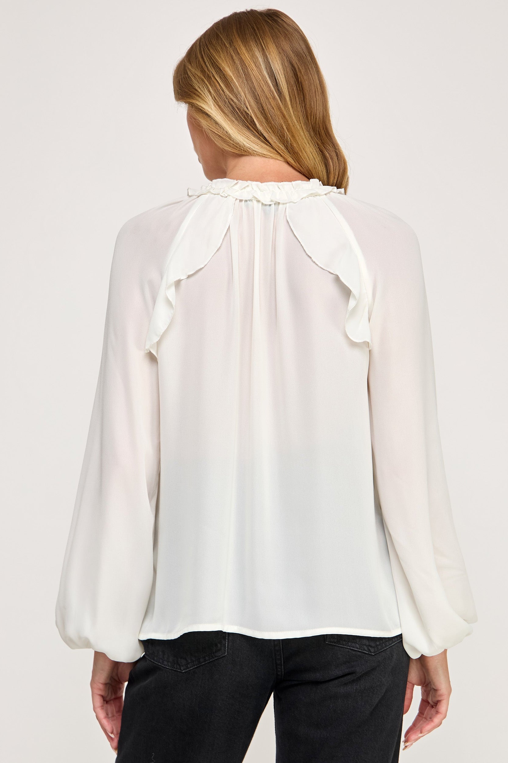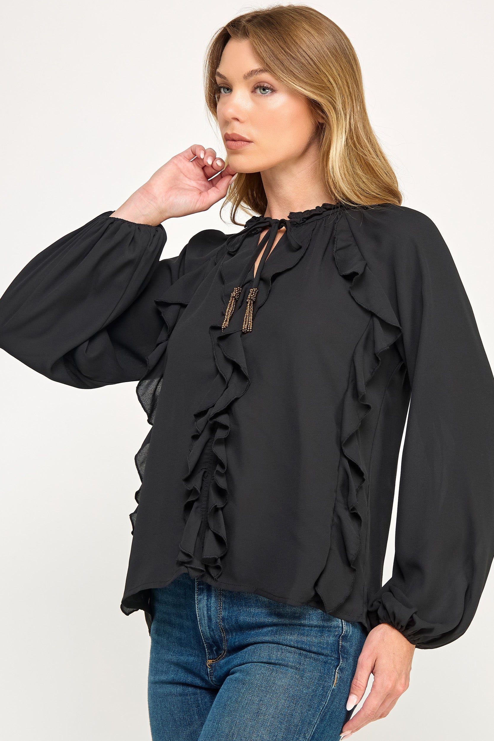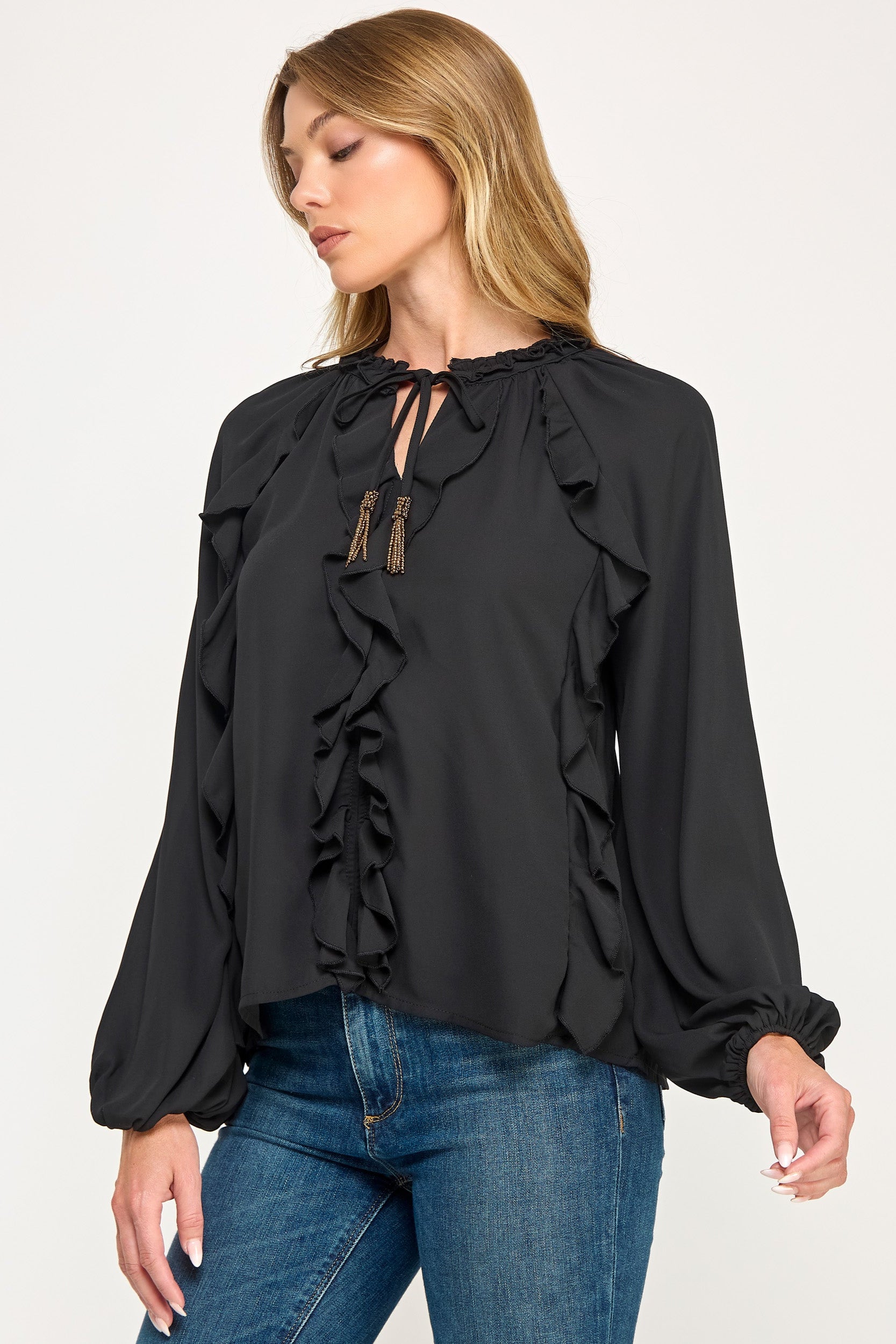 Romantic and versatile, this ruffle long sleeve top features elegant puff sleeves with distinctive beaded aglet detailing. The adjustable drawstring neckline offers alternate styling options, while front ruffle details add sophisticated texture to this graceful silhouette.