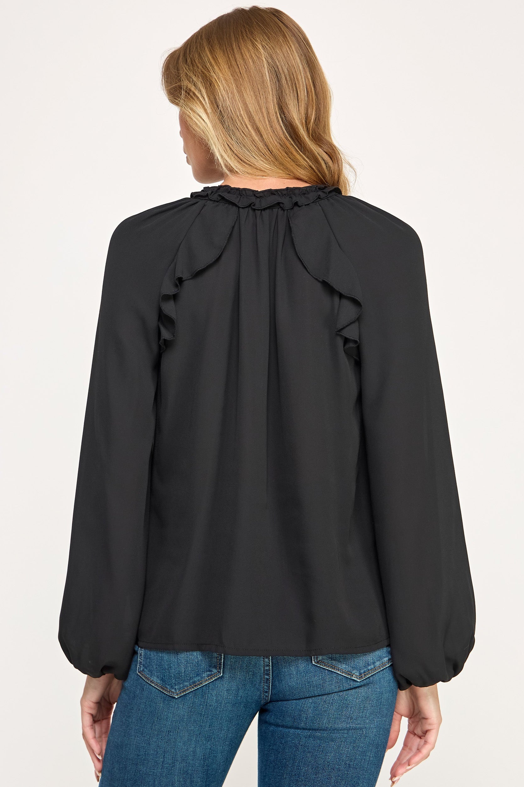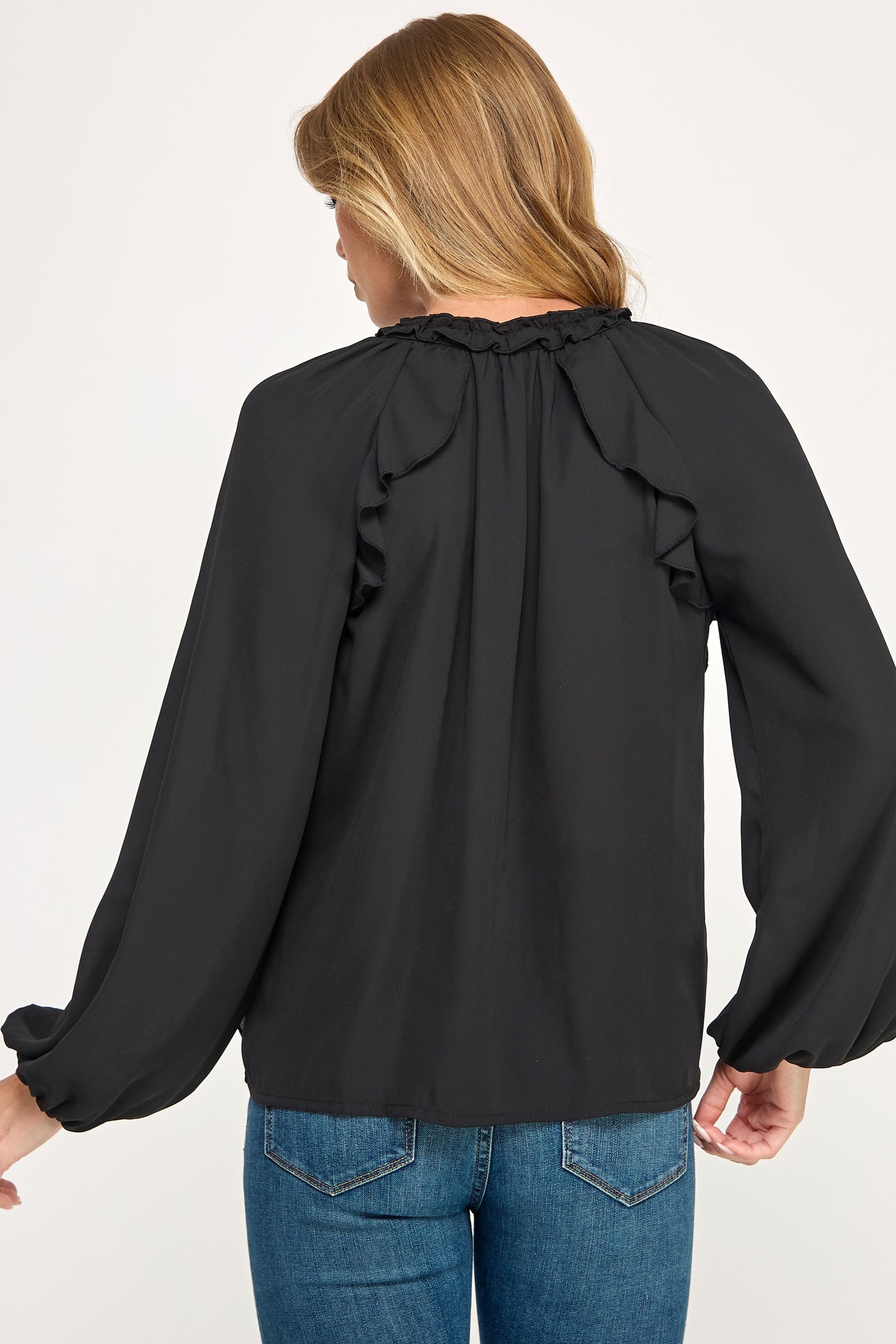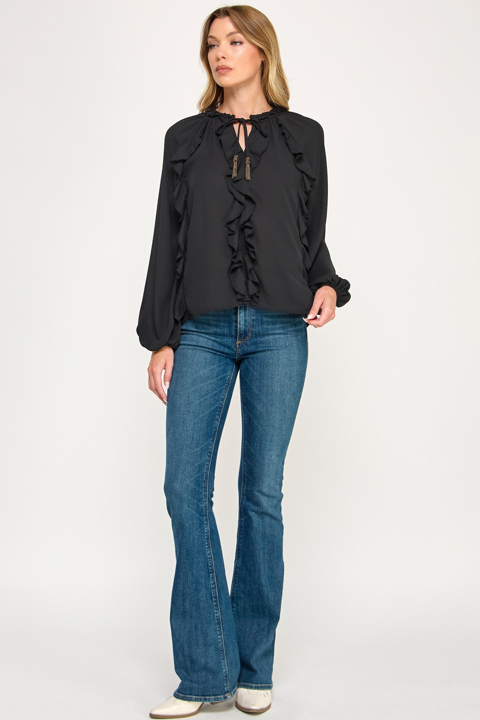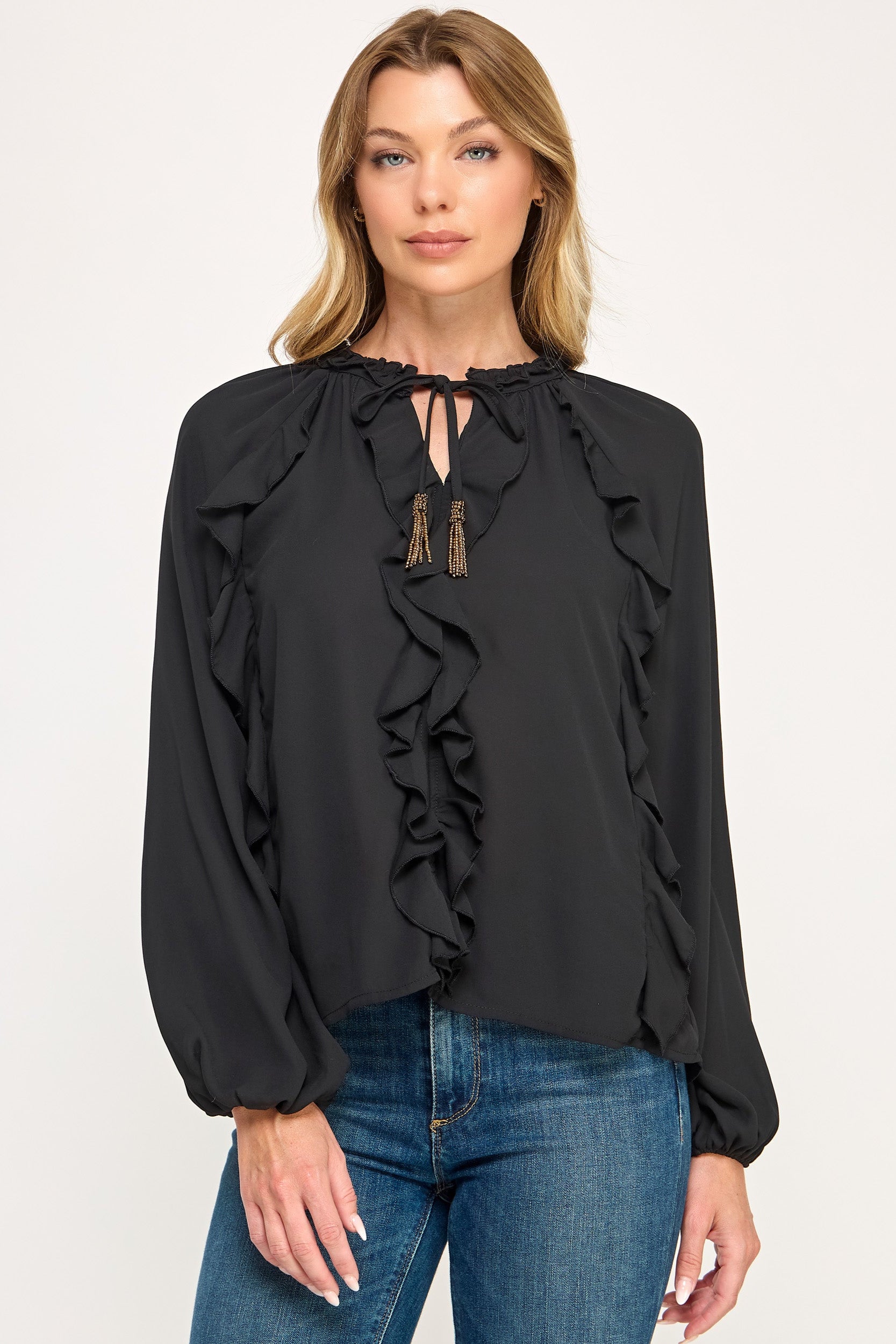 Romantic and versatile, this ruffle long sleeve top features elegant puff sleeves with distinctive beaded aglet detailing. The adjustable drawstring neckline offers alternate styling options, while front ruffle details add sophisticated texture to this graceful silhouette.