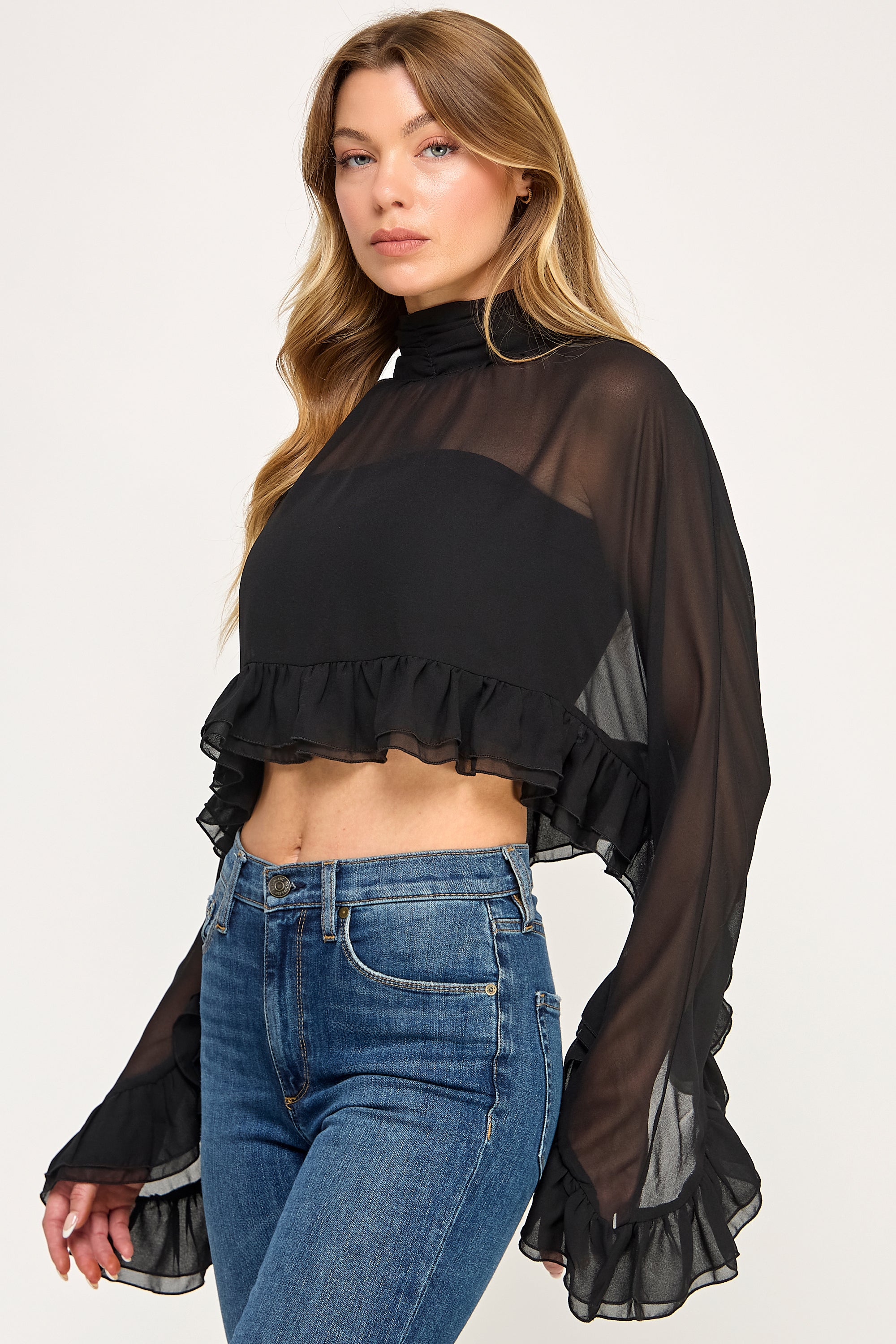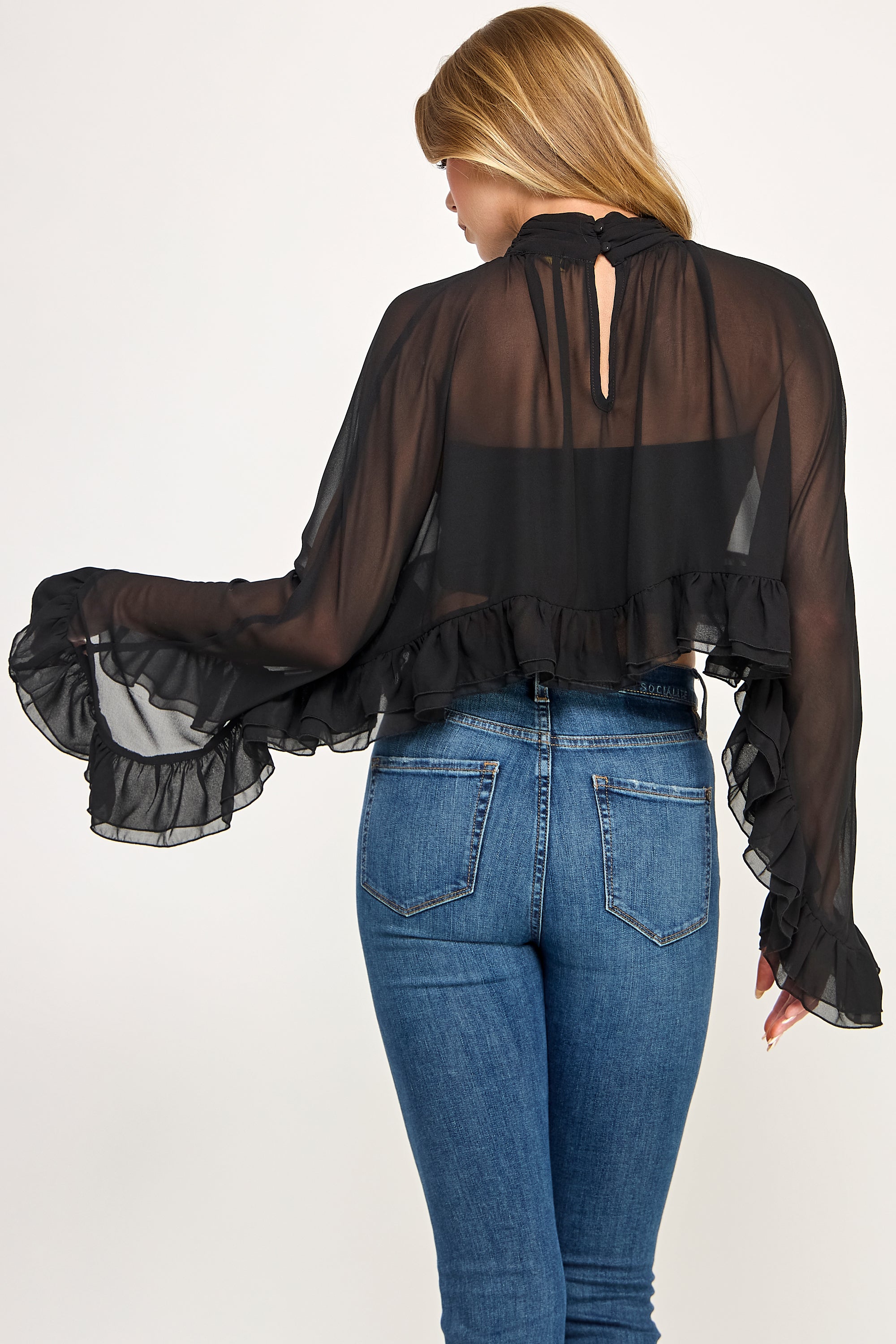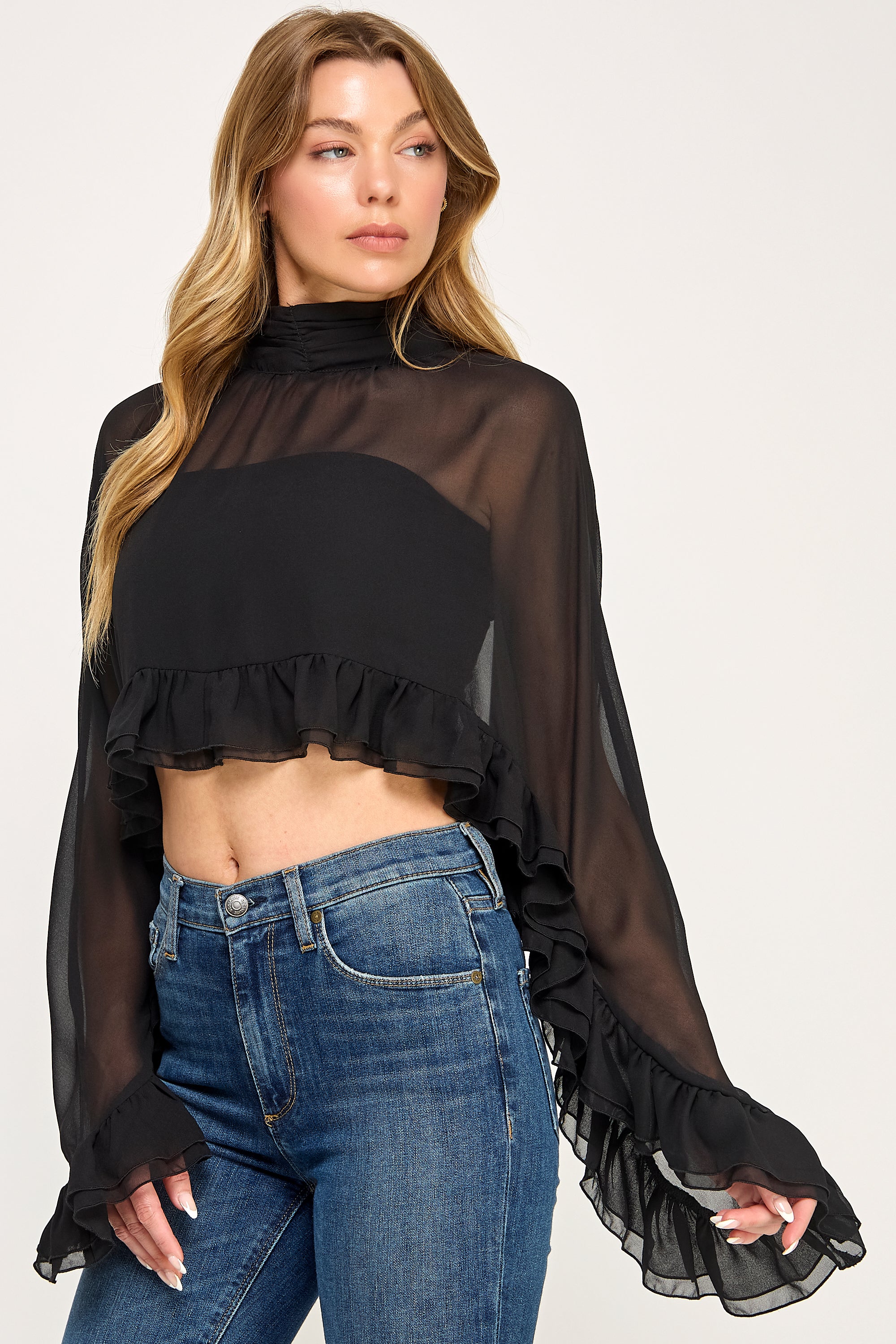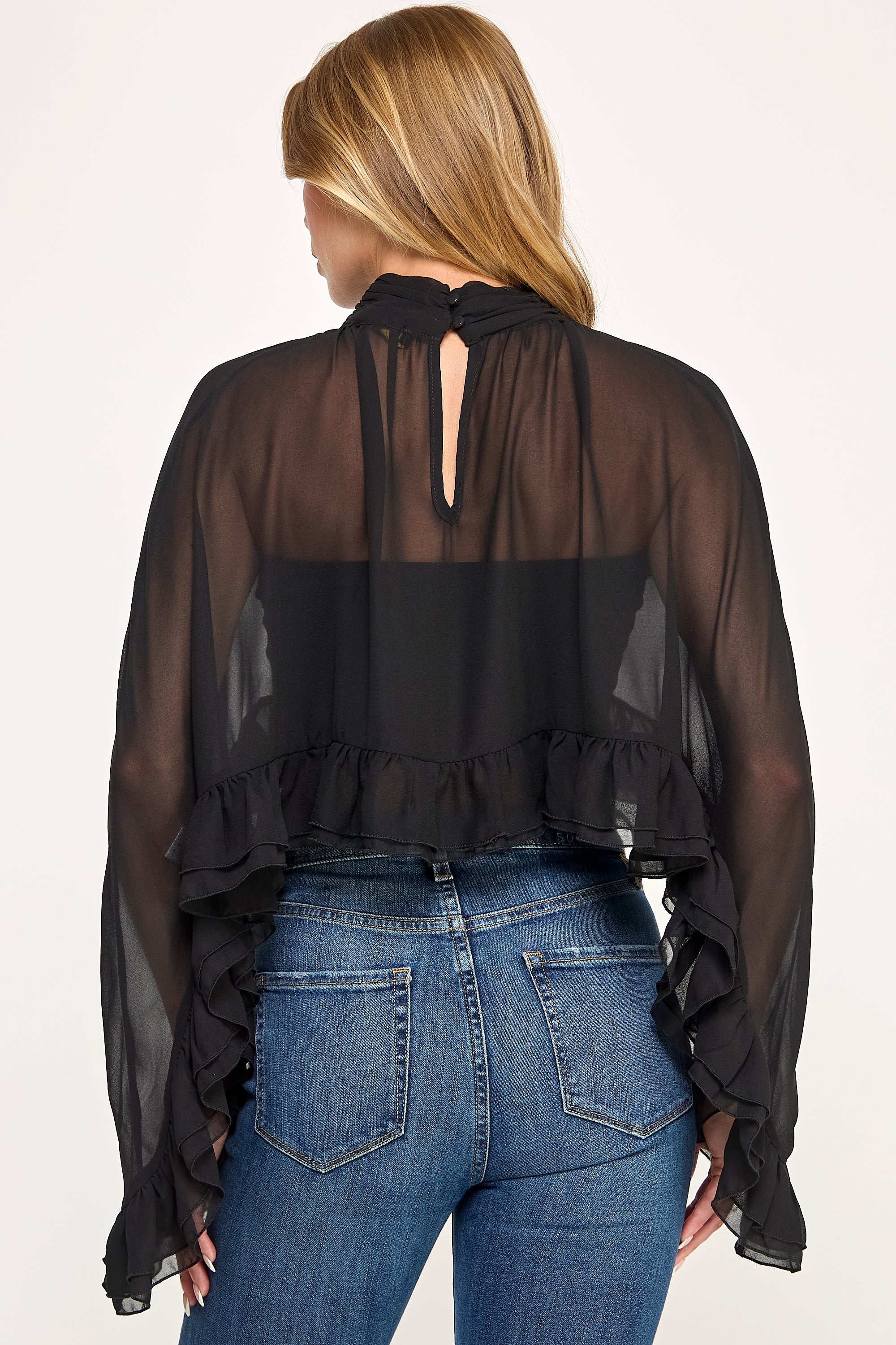 Flowing and dramatic, this long-sleeve crop top features a sheer chiffon poncho silhouette with a high smocked mock neckline and back keyhole button closure. The design showcases layered bell sleeves with ruffle trim and a soft ruffle hem finish for graceful movement.