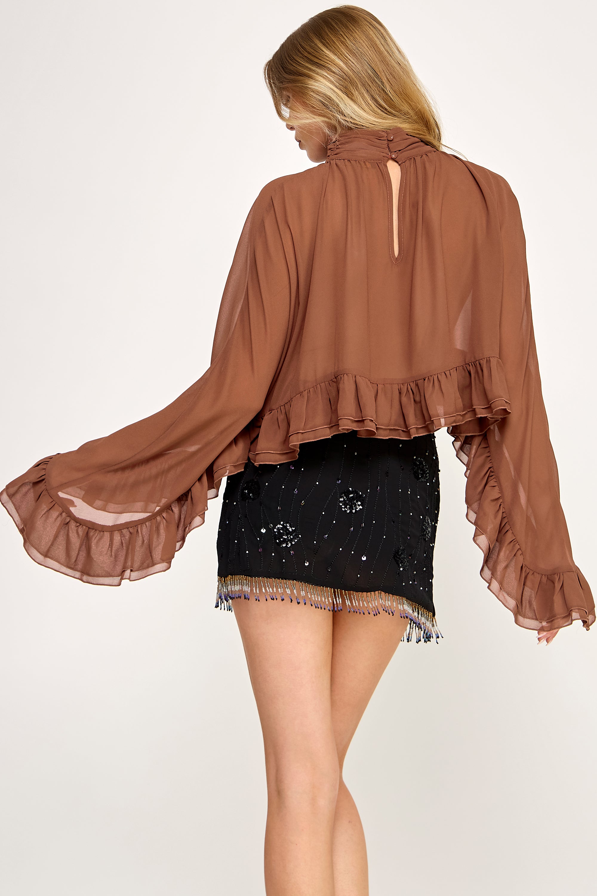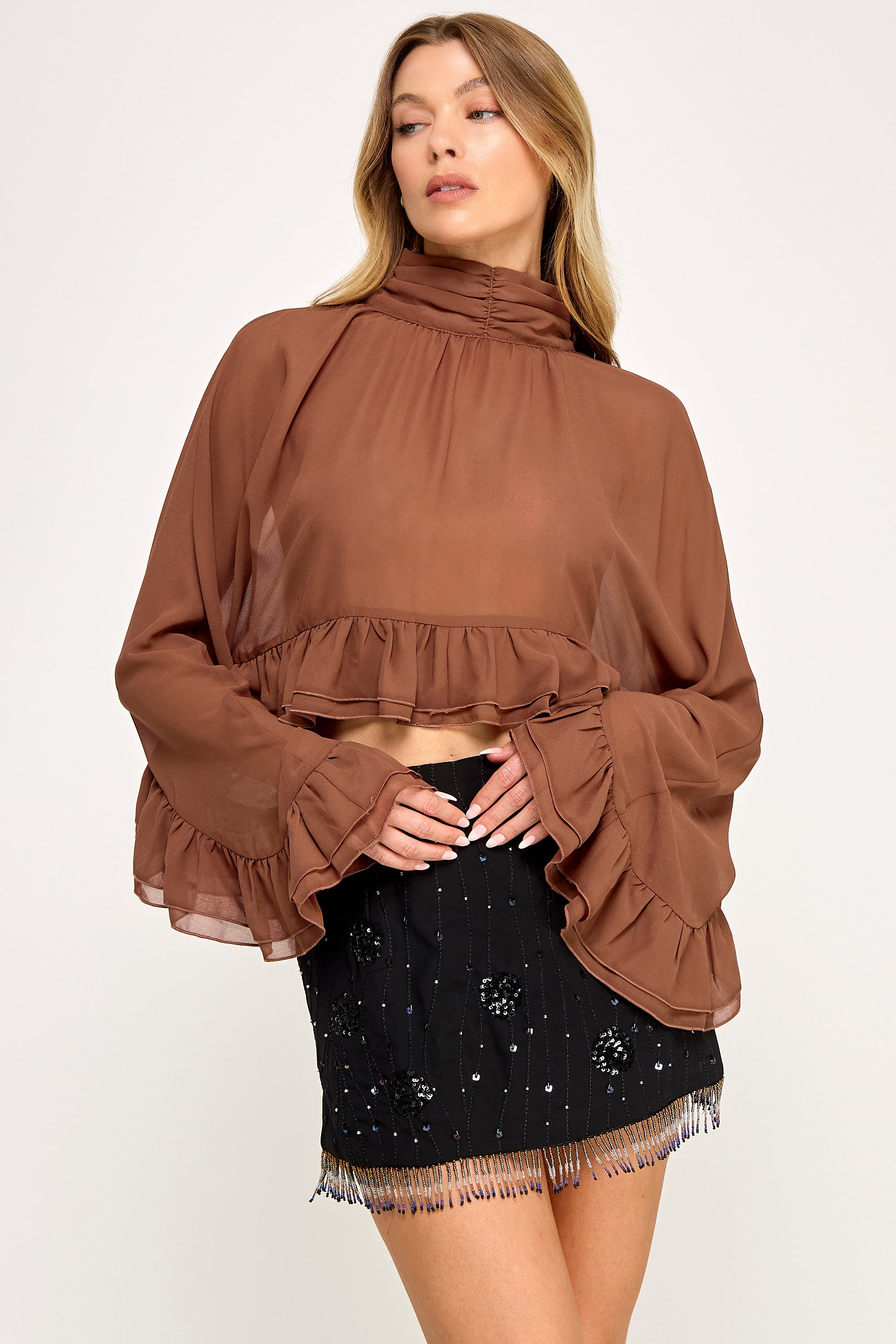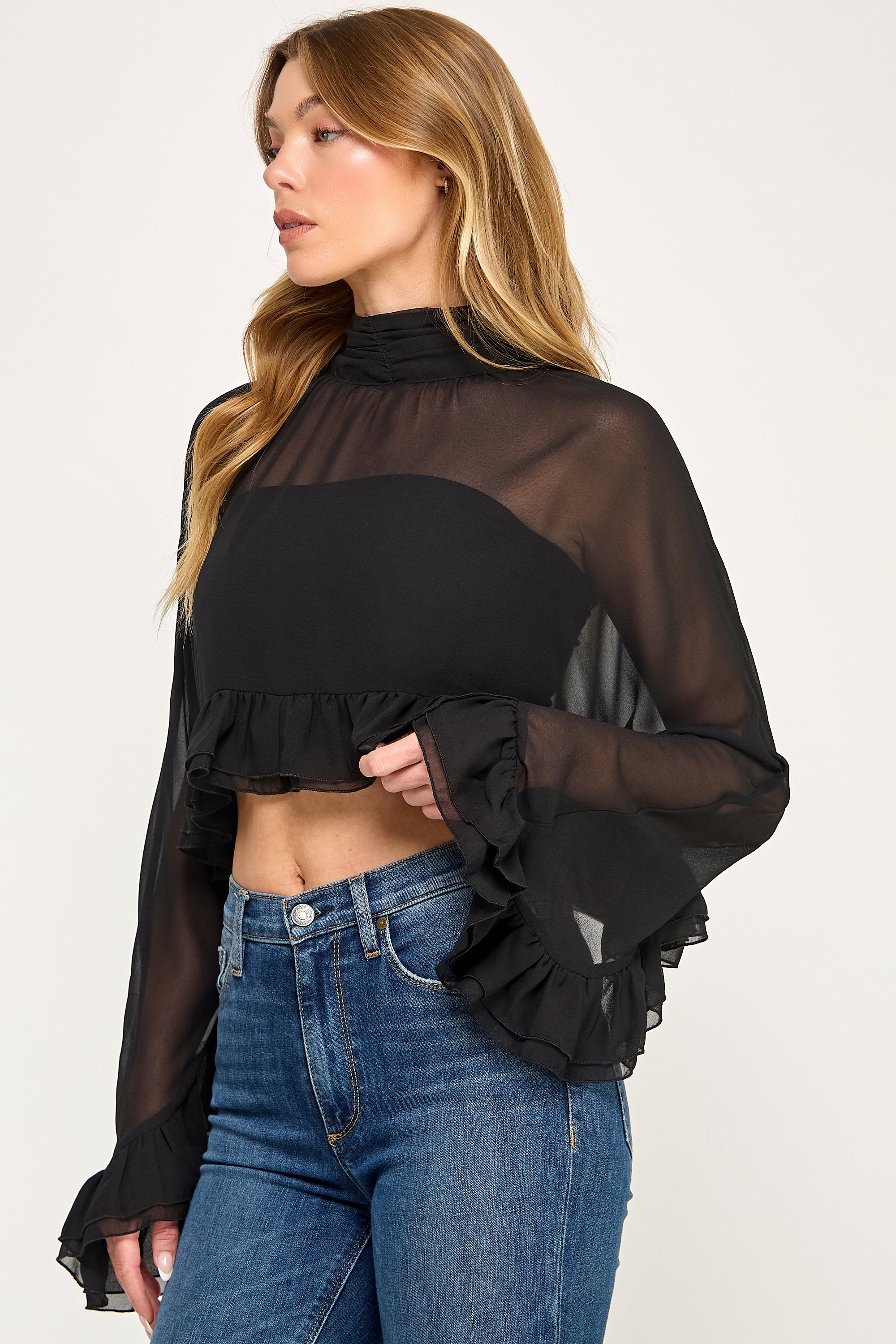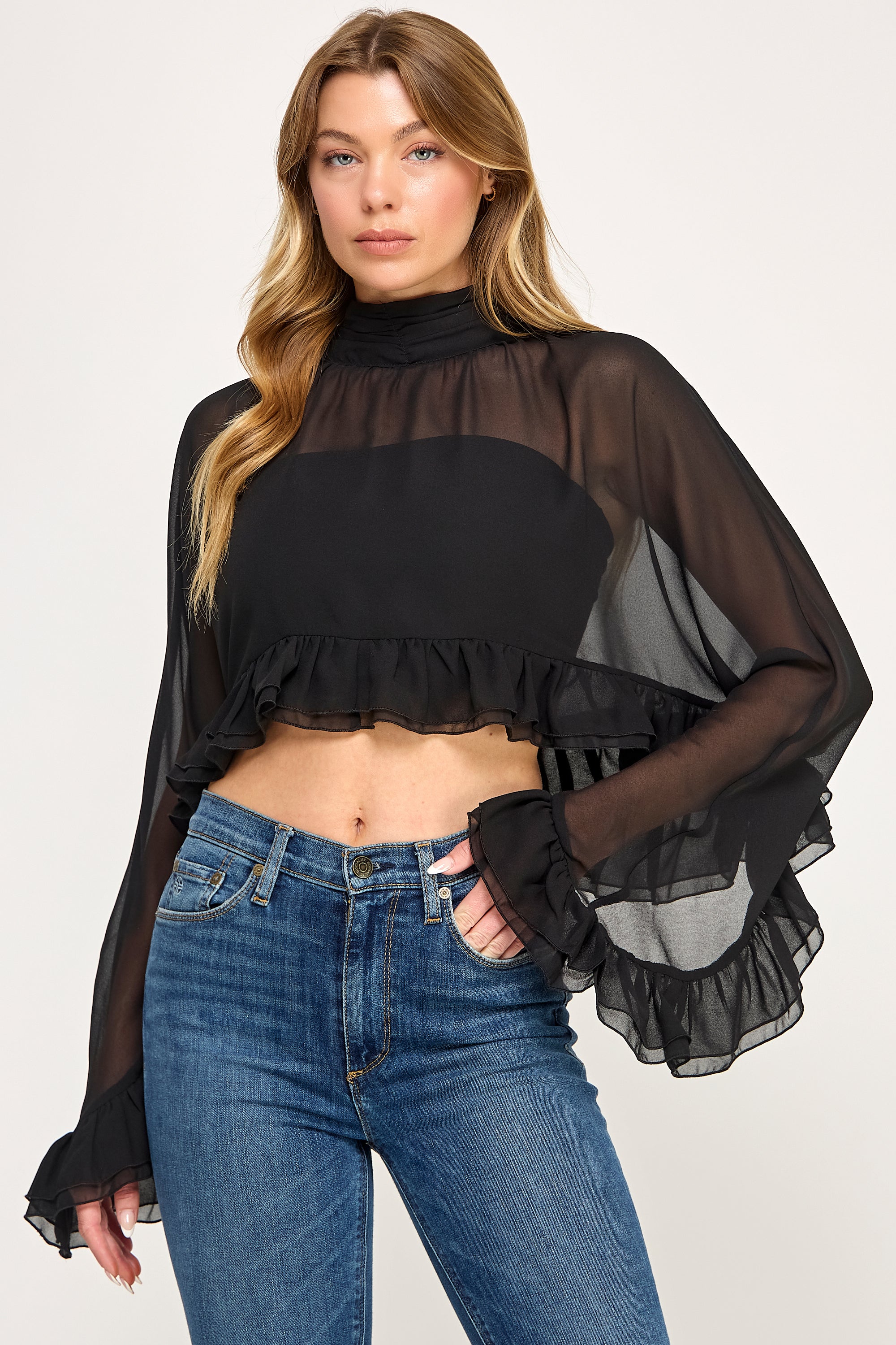 Flowing and dramatic, this long-sleeve crop top features a sheer chiffon poncho silhouette with a high smocked mock neckline and back keyhole button closure. The design showcases layered bell sleeves with ruffle trim and a soft ruffle hem finish for graceful movement.