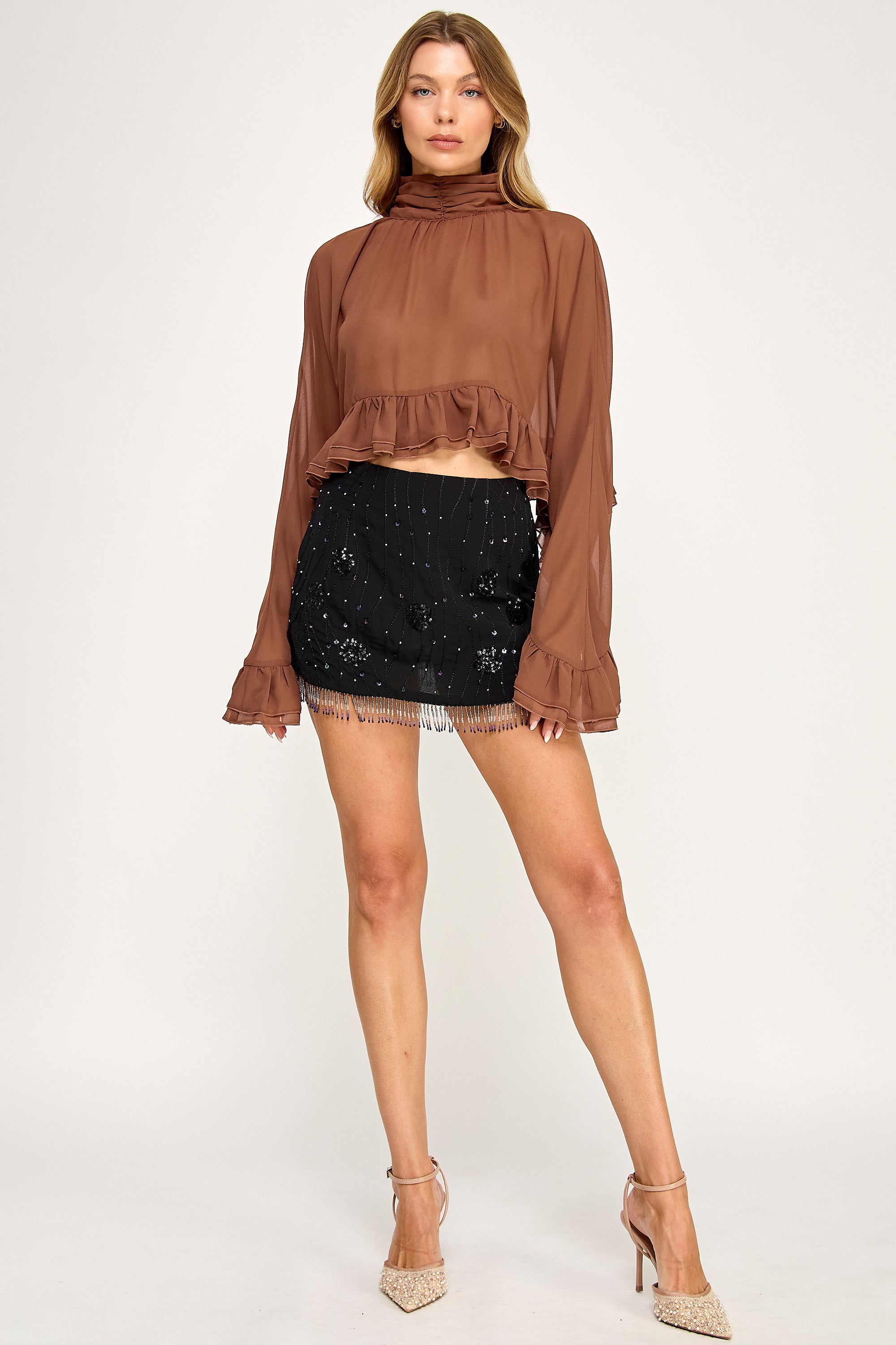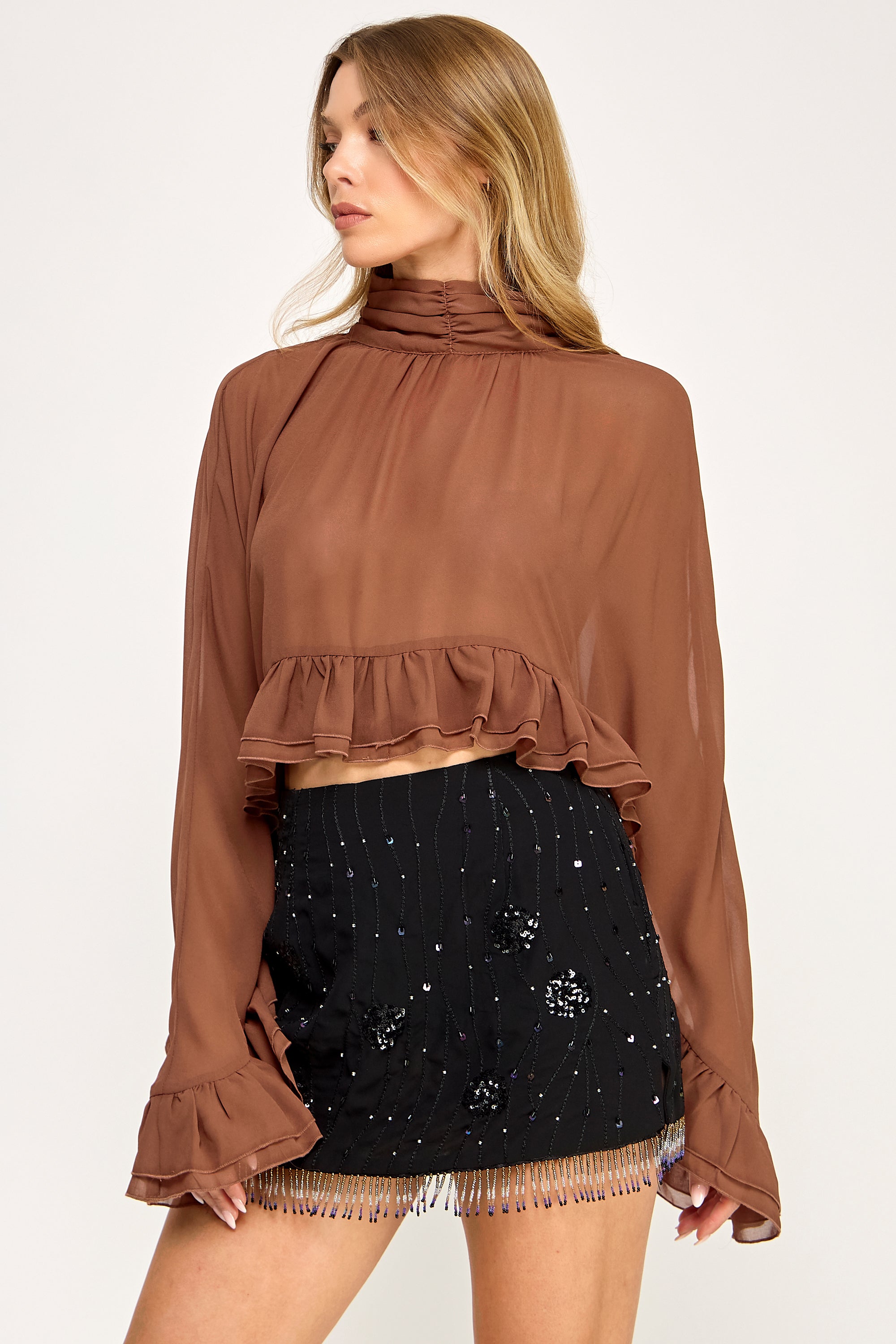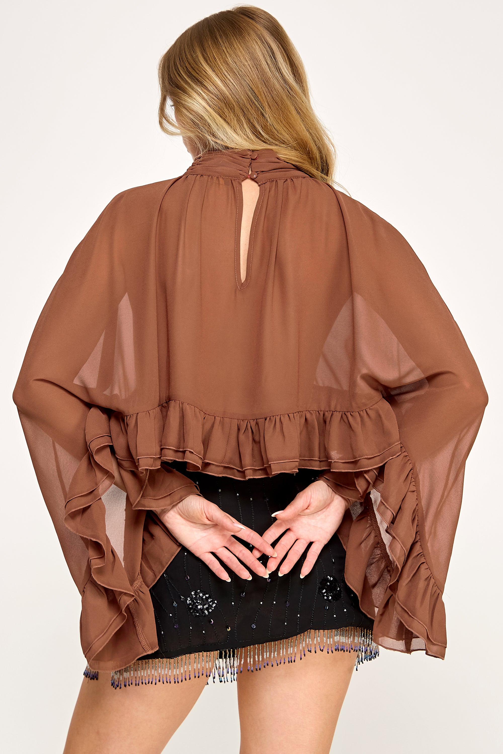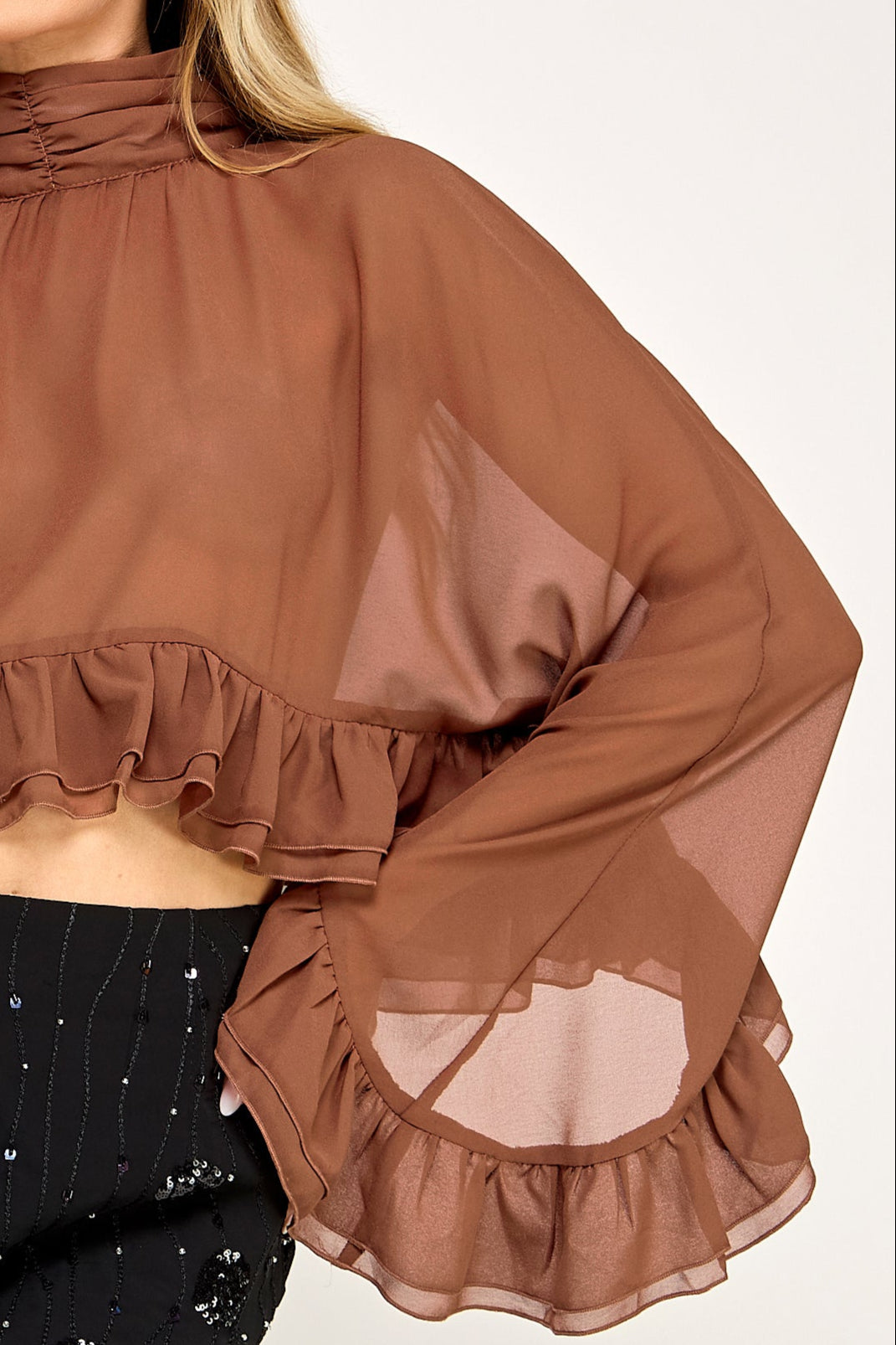 Flowing and dramatic, this long-sleeve crop top features a sheer chiffon poncho silhouette with a high smocked mock neckline and back keyhole button closure. The design showcases layered bell sleeves with ruffle trim and a soft ruffle hem finish for graceful movement.