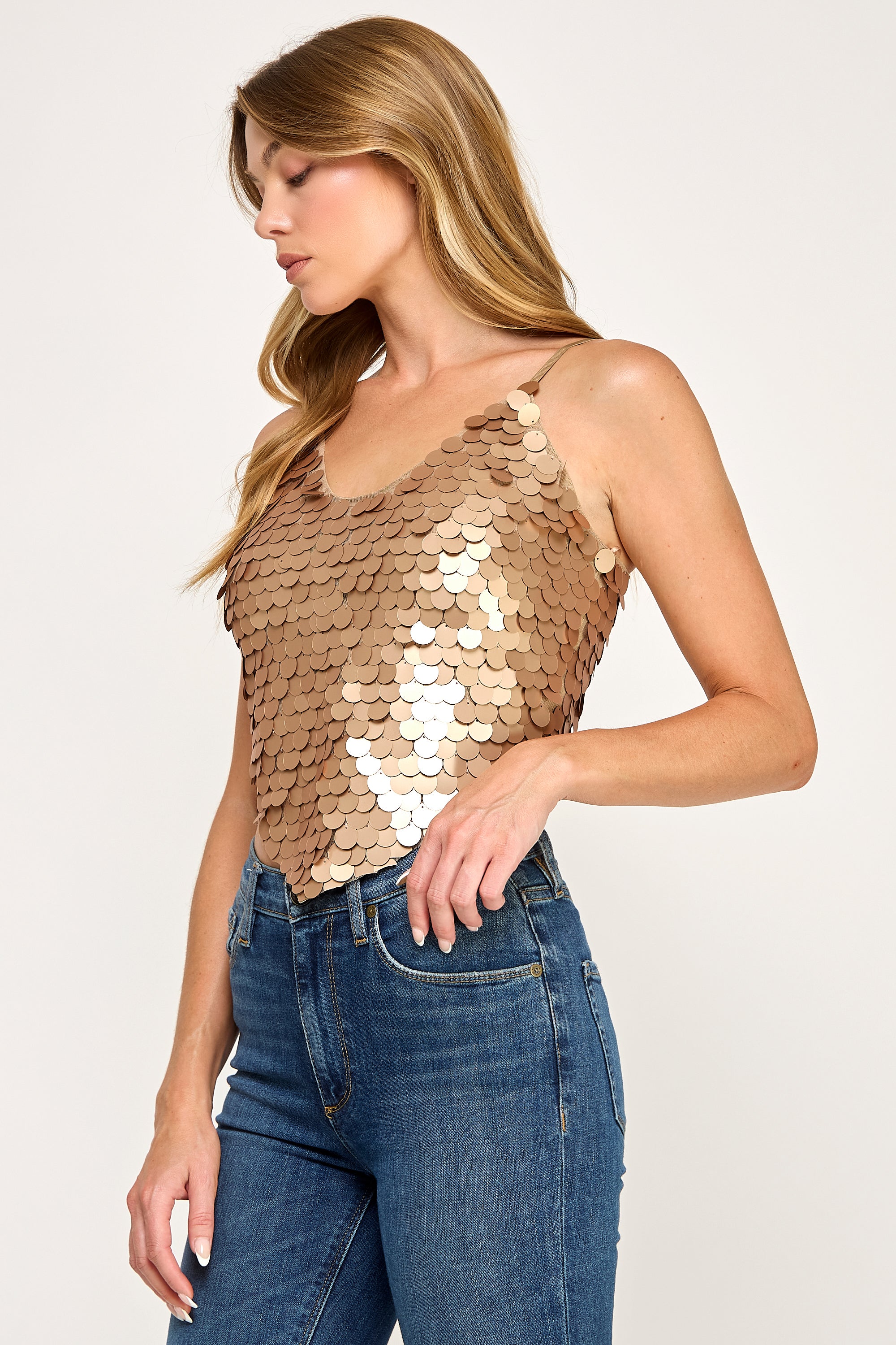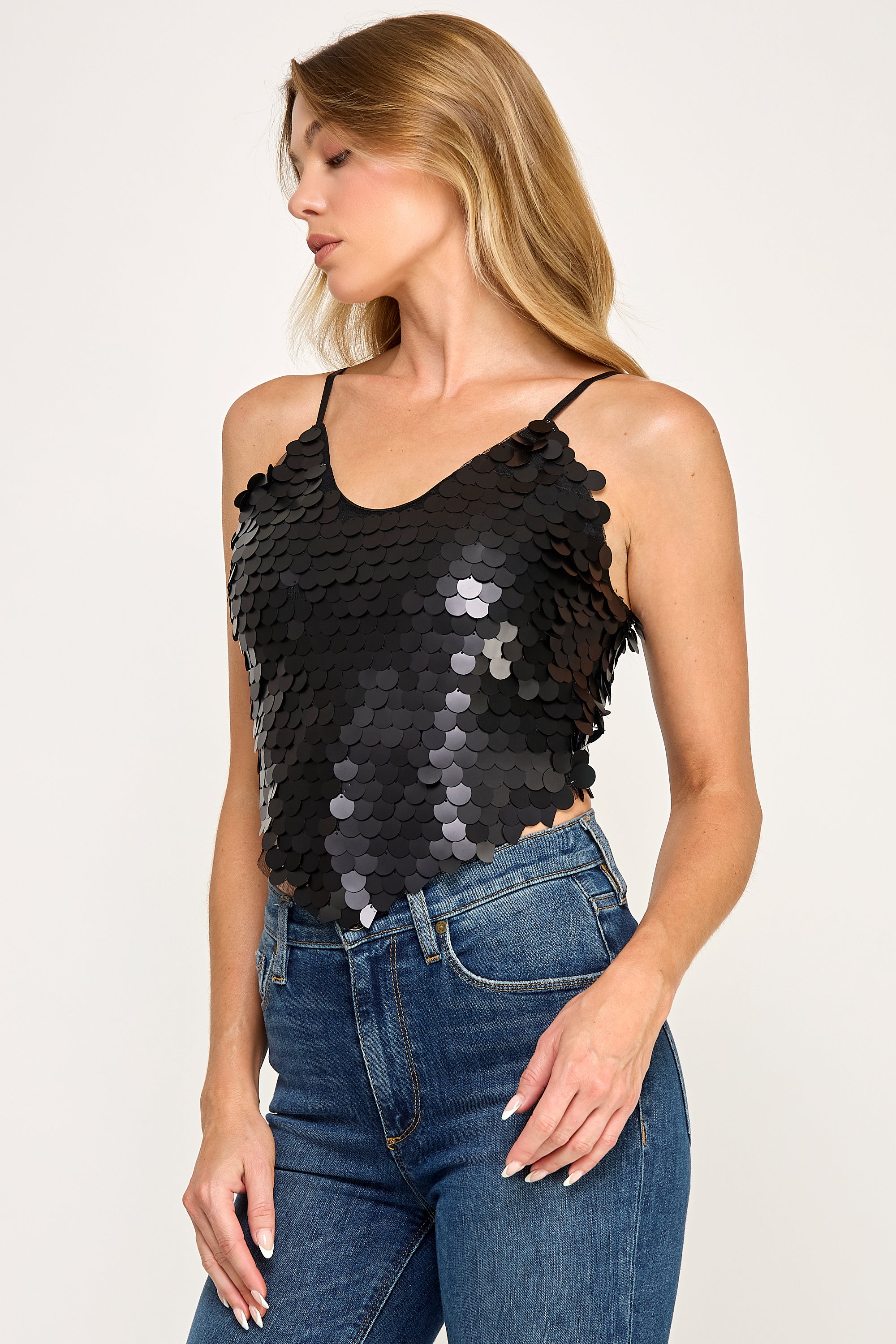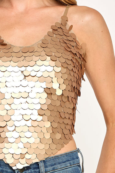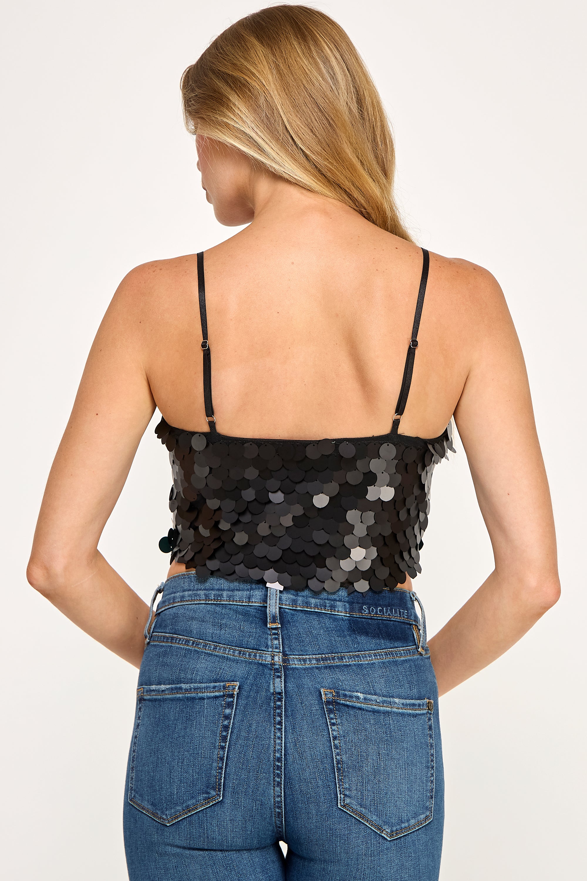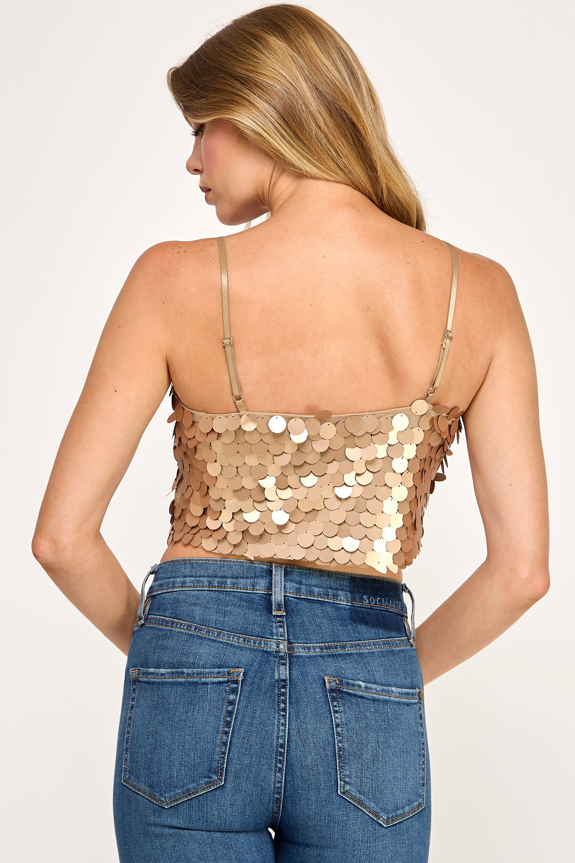 Glamorous and structured, this corset crop top features sequined circles in gold or black with elegant spaghetti straps. The basque waist design creates a flattering sweetheart neckline, combining vintage-inspired corsetry with contemporary sparkle for a sophisticated statement piece.